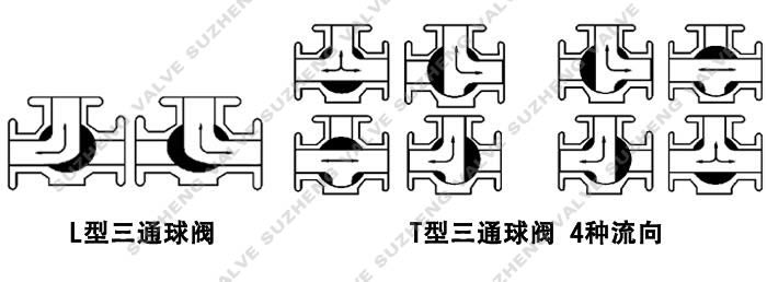 氣(qi)動三通球閥分(fen)L型和T型,介質流(liu)通方向見下圖(tú)。氣動三通L型球(qiu)閥适用于介質(zhi)流向的切換,能(néng)使相互垂直的(de)兩⚽個通道連通(tong):氣動三通T型球(qiu)閥适用于介質(zhì)的分流、合流或(huò)流向切換,T型孔(kong)道可以使三個(ge)通道互相連通(tong)或使其中兩個(gè)通道連通,氣🛀🏻動(dong)三通球閥一般(bān)采用三個閥座(zuò)結💛構,亦可根據(jù)用戶要求采用(yong)四閥座結構。